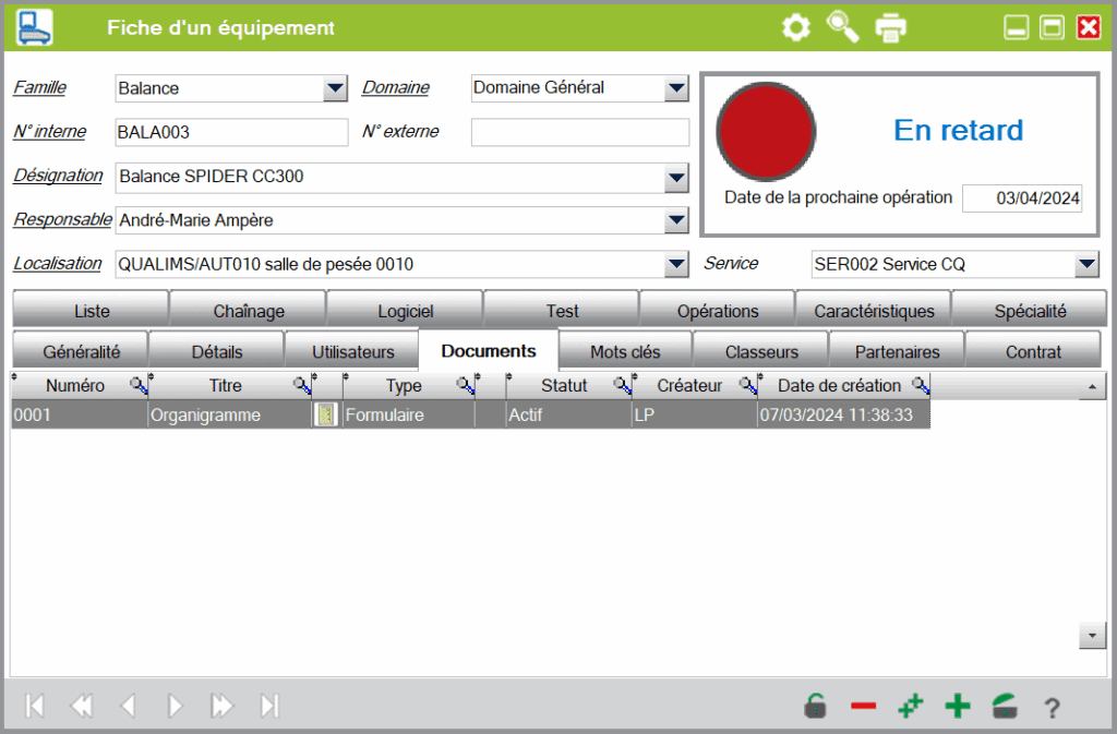 Chaque équipement dispose d’une fiche complète : caractéristiques, historique d’utilisation, contrats associés, documents liés (certificats, rapports de qualification, manuels), pièces détachées et utilisateurs habilités.