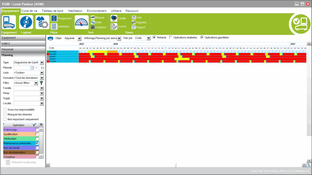 EQM permet de programmer et de suivre les maintenances préventives, correctives et les qualifications réglementaires. Les alertes automatiques garantissent qu’aucune échéance critique (calibration, qualification opérationnelle, vérification métrologique) n’est oubliée.